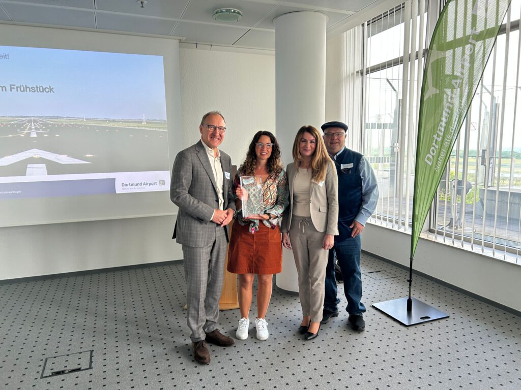Beim Bewusst wie vor Ort Nachhaltigkeitsnetzwerken am Flughafen Dortmund konnte ein kleines Jubiläum gefeiert werden. Vor 10 Jahren trafen sich dort erstmals 8 Unternehmen, um sich über Möglichkeiten nachhaltigen Handelns und gesellschaftlicher Verantwortung zu informieren. Niemand ahnte damals, dass daraus ein Unternehmensverbund mit mehr als 110 Mitgliedern werden würde. Der Dortmunder Airport war mit seiner Nachhaltigkeitsbeauftragten Heike Helmboldt von Beginn an dabei. Flughafenchef Ludger von Bebber und Heike Helmboldt freuten sich über die „Excellence“ Auszeichnung des BEWUSST WIE eV, welche die Stellvertretende Vorstandsvorsitzende Graziella Strothmüller überreichte.
